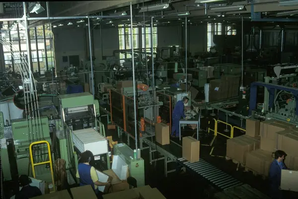 Fabrikkinteriør. Pakkeavdeling. Produksjon av tobakk hos Tiedemanns Tobaksfabrik.