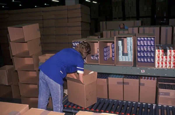 Fabrikkinteriør. Pakkeavdeling. Produksjon av tobakk hos Tiedemanns Tobaksfabrik.