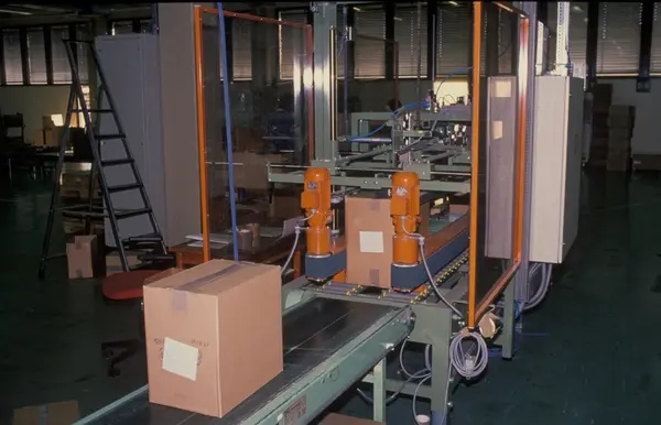 Fabrikkinteriør. Pakkeavdeling. Produksjon av tobakk hos Tiedemanns Tobaksfabrik.