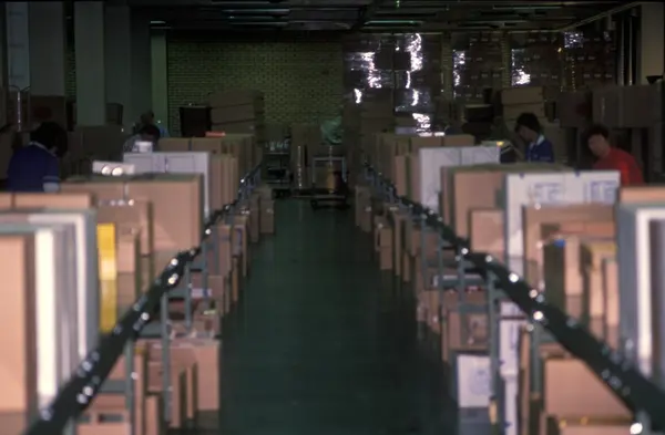 Fabrikkinteriør. Pakkeavdeling. Produksjon av tobakk hos Tiedemanns Tobaksfabrik.