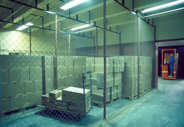 Fabrikkinteriør. Pakkeavdeling. Produksjon av tobakk hos Tiedemanns Tobaksfabrik.