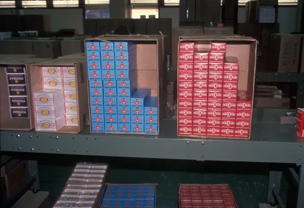 Fabrikkinteriør. Pakkeavdeling. Produksjon av tobakk hos Tiedemanns Tobaksfabrik.