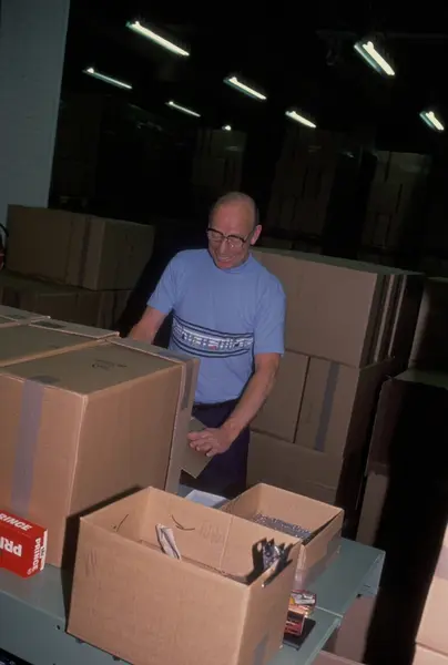 Fabrikkinteriør. Pakkeavdeling. Produksjon av tobakk hos Tiedemanns Tobaksfabrik.