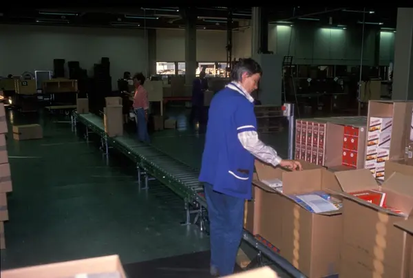 Fabrikkinteriør. Pakkeavdeling. Produksjon av tobakk hos Tiedemanns Tobaksfabrik.