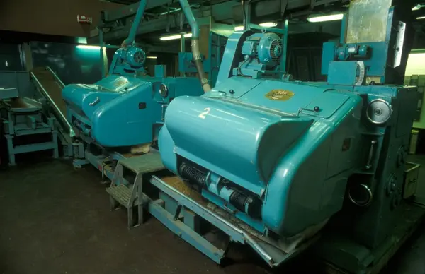 Fabrikkinteriør. Skjæring av sigarettobakk. Produksjon av sigaretter hos Tiedemanns Tobaksfabrik på Hovin.