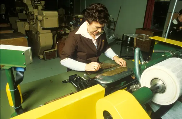 Fabrikkinteriør. Utstansing av dekkblad til sigar. Produksjon av sigarer hos Tiedemanns Tobaksfabrik på Hovin.