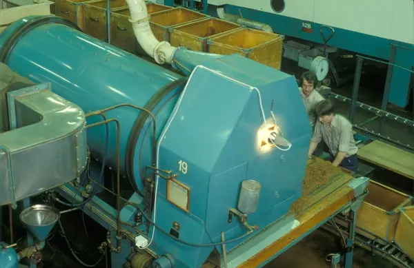 Fabrikkinteriør. Flavourtrommel og fylling i kasser. Produksjon av sigaretter hos Tiedemanns Tobaksfabrik på Hovin.