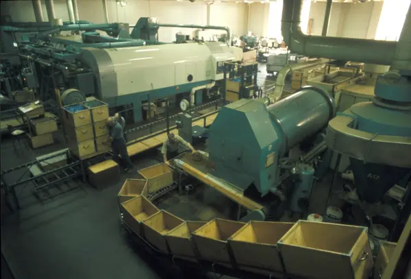 Fabrikkinteriør. Flavourtrommel. Produksjon av sigaretter hos Tiedemanns Tobaksfabrik på Hovin.
