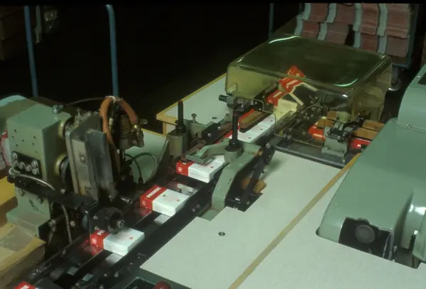 Fabrikkinteriør. Sigarettpakkemaskin. Produksjon av sigaretter hos Tiedemanns Tobaksfabrik på Hovin.
