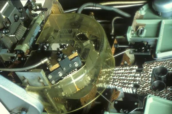 Fabrikkinteriør. Sigarettpakkemaskin. Produksjon av sigaretter hos Tiedemanns Tobaksfabrik på Hovin.
