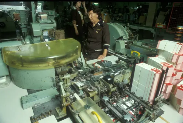 Fabrikkinteriør. Sigarettpakkemaskin. Produksjon av sigaretter hos Tiedemanns Tobaksfabrik på Hovin.