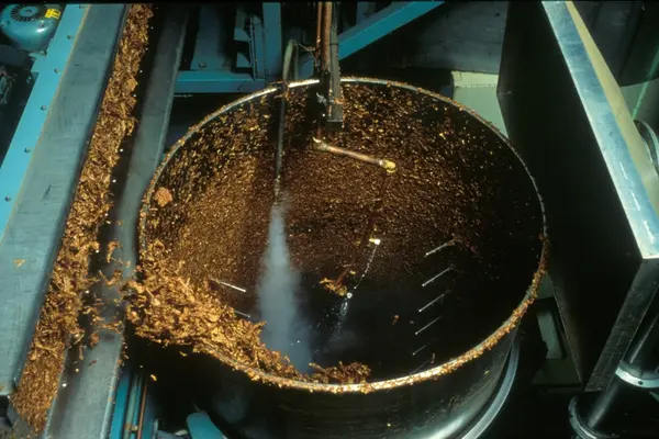 Fabrikkinteriør. Sprenking av burley. Produksjon av sigaretter hos Tiedemanns Tobaksfabrik på Hovin.