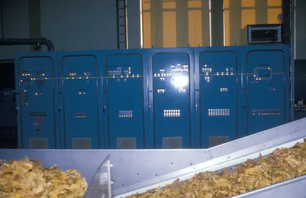 Fabrikkinteriør. Produksjon av sigaretter hos Tiedemanns Tobaksfabrik på Hovin. Fra bildeserie brukt i forbindelse med Tiedemanns tobakkskurs.