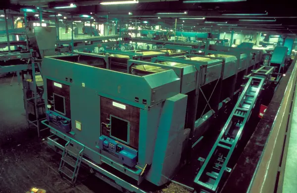 Fabrikkinteriør. Produksjon av sigaretter hos Tiedemanns Tobaksfabrik på Hovin. Fra bildeserie brukt i forbindelse med Tiedemanns tobakkskurs.