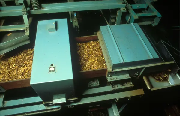 Fabrikkinteriør. Produksjon av sigaretter hos Tiedemanns Tobaksfabrik på Hovin. Fra bildeserie brukt i forbindelse med Tiedemanns tobakkskurs.