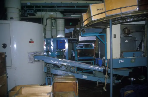Fabrikkinteriør. Produksjon av sigaretter hos Tiedemanns Tobaksfabrik på Hovin. Fra bildeserie brukt i forbindelse med Tiedemanns tobakkskurs.