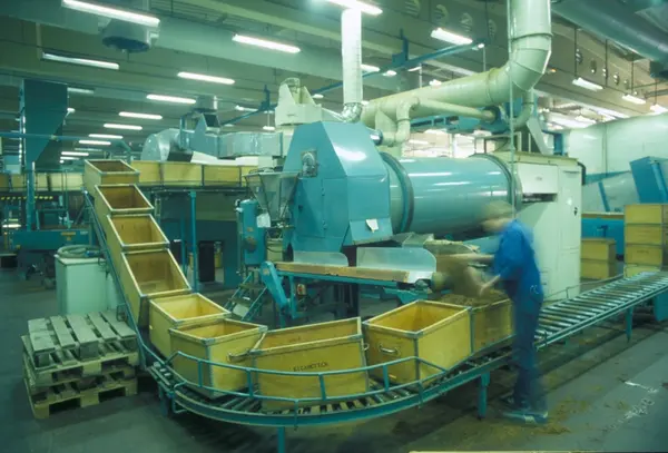 Fabrikkinteriør. Produksjon av sigaretter hos Tiedemanns Tobaksfabrik på Hovin. Fra bildeserie brukt i forbindelse med Tiedemanns tobakkskurs.