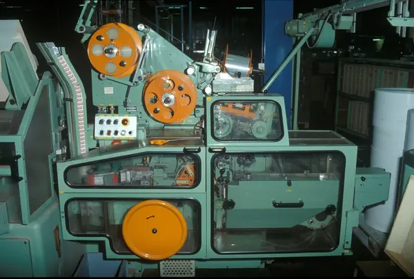Fabrikkinteriør. Produksjon av sigaretter hos Tiedemanns Tobaksfabrik på Hovin. Fra bildeserie brukt i forbindelse med Tiedemanns tobakkskurs.
