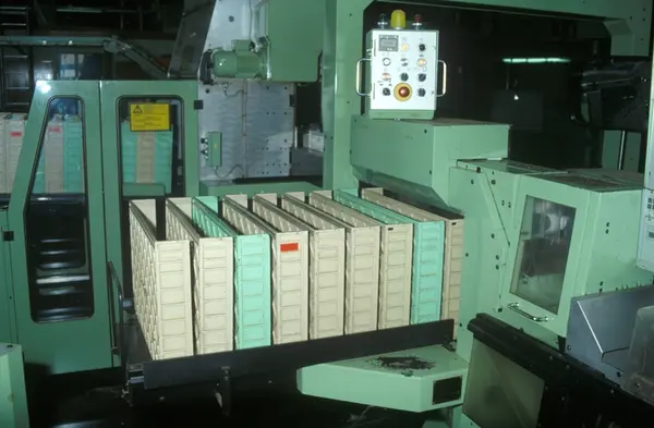 Fabrikkinteriør. Produksjon av sigaretter hos Tiedemanns Tobaksfabrik på Hovin. Fra bildeserie brukt i forbindelse med Tiedemanns tobakkskurs.