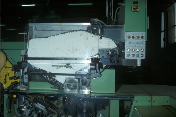 Fabrikkinteriør. Produksjon av sigaretter hos Tiedemanns Tobaksfabrik på Hovin. Fra bildeserie brukt i forbindelse med Tiedemanns tobakkskurs.