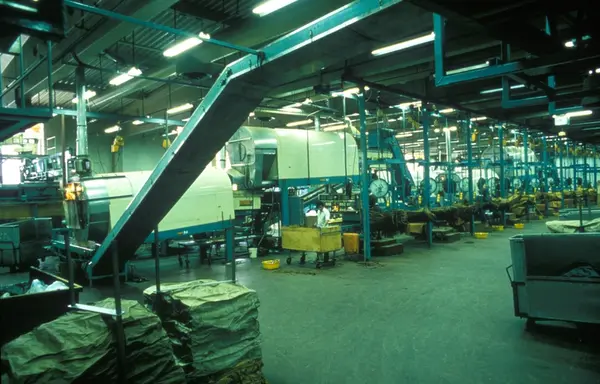 Fabrikkinteriør. Oversikt røyketobakk tilberedning. Produksjon av røyketobakk hos Tiedemanns Tobaksfabrik.