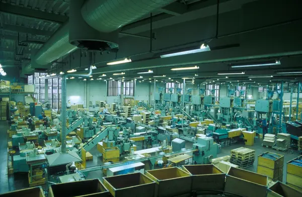 Fabrikkinteriør. Oversikt røyketobakk - pakkeavdeling. Produksjon av røyketobakk hos Tiedemanns Tobaksfabrik.