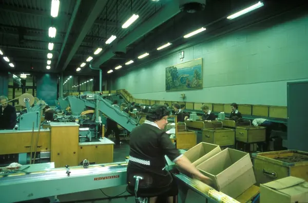 Fabrikkinteriør. Nedpakking i kartong. Produksjon av røyketobakk hos Tiedemanns Tobaksfabrik.