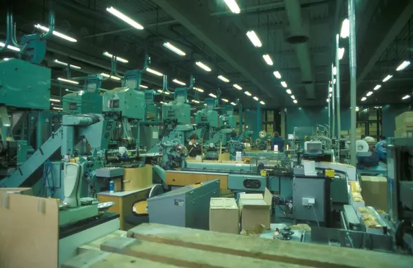 Fabrikkinteriør. Oversikt røyketobakk - pakkeavdelingen. Produksjon av røyketobakk hos Tiedemanns Tobaksfabrik.