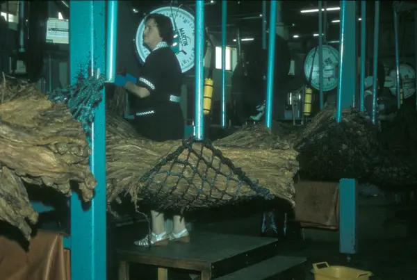 Fabrikkinteriør. Innveiing i prosess - mørk tobakk. Produksjon av røyketobakk hos Tiedemanns Tobaksfabrik.
