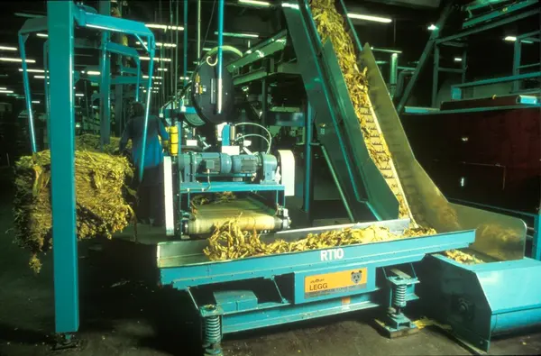 Fabrikkinteriør. Innveiing i prosess - lys tobakk. Produksjon av røyketobakk hos Tiedemanns Tobaksfabrik.