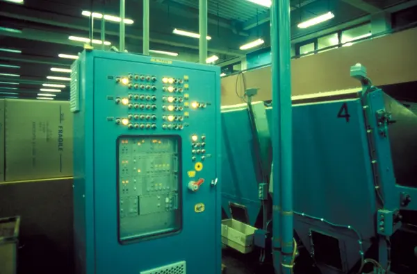 Fabrikkinteriør. Automatisk veiemaskin (styreskap). Produksjon av røyketobakk hos Tiedemanns Tobaksfabrik.