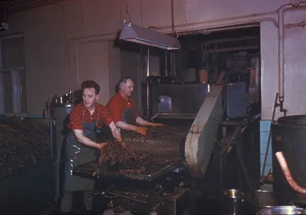 Fabrikkinteriør. Sausing. Produksjon av røyketobakk hos Tiedemanns Tobaksfabrik. Fra Tiedemanns kursmateriell "Fra plantasjen til pipen".