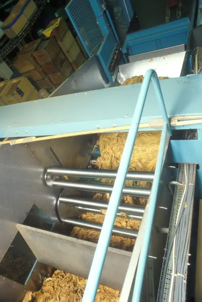 Fabrikkinteriør. Røyketobakk tilberedning. Produksjon av tobakk hos Tiedemanns Tobaksfabrik på Hovin. Fra billedserie laget i forbindelse med Tiedemanns interne tobakkskurs.