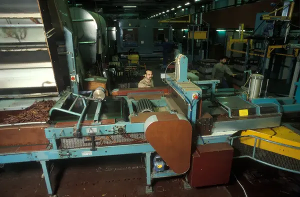 Fabrikkinteriør. Røyketobakk tilberedning. Produksjon av tobakk hos Tiedemanns Tobaksfabrik på Hovin. Fra billedserie laget i forbindelse med Tiedemanns interne tobakkskurs.