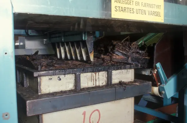 Fabrikkinteriør. Røyketobakk tilberedning. Produksjon av tobakk hos Tiedemanns Tobaksfabrik på Hovin. Fra billedserie laget i forbindelse med Tiedemanns interne tobakkskurs.