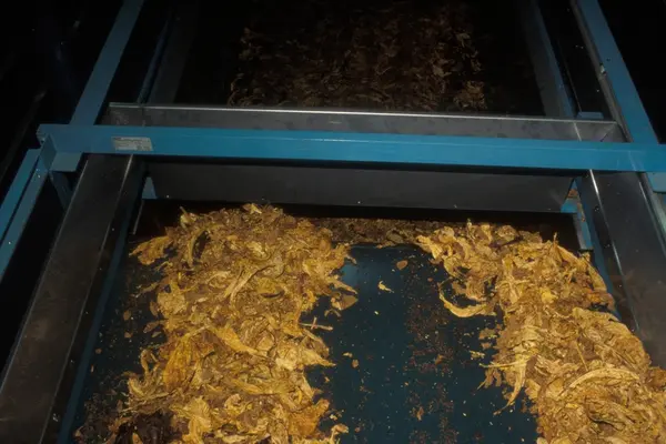 Fabrikkinteriør. Røyketobakk tilberedning. Produksjon av tobakk hos Tiedemanns Tobaksfabrik på Hovin. Fra billedserie laget i forbindelse med Tiedemanns interne tobakkskurs.