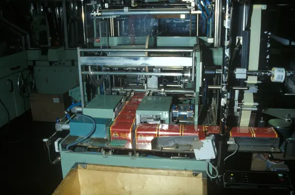 Fabrikkinteriør. Pakkeavdeling røyketobakk. Produksjon av tobakk hos Tiedemanns Tobaksfabrik på Hovin. Fra billedserie laget i forbindelse med Tiedemanns interne tobakkskurs.