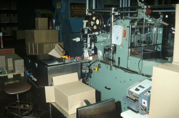 Fabrikkinteriør. Pakkeavdeling røyketobakk. Produksjon av tobakk hos Tiedemanns Tobaksfabrik på Hovin. Fra billedserie laget i forbindelse med Tiedemanns interne tobakkskurs.