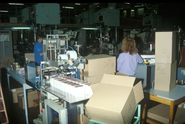 Fabrikkinteriør. Pakkeavdeling røyketobakk. Produksjon av tobakk hos Tiedemanns Tobaksfabrik på Hovin. Fra billedserie laget i forbindelse med Tiedemanns interne tobakkskurs.
