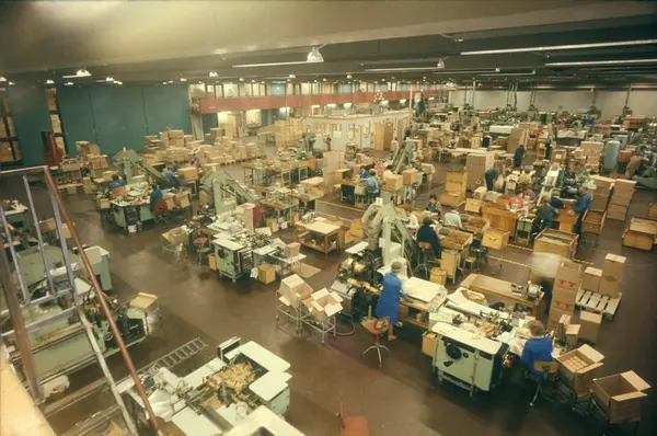 Fabrikkinteriør. Pakkeavdeling, røyketobakk. Produksjon av tobakk hos Tiedemanns Tobaksfabrik.