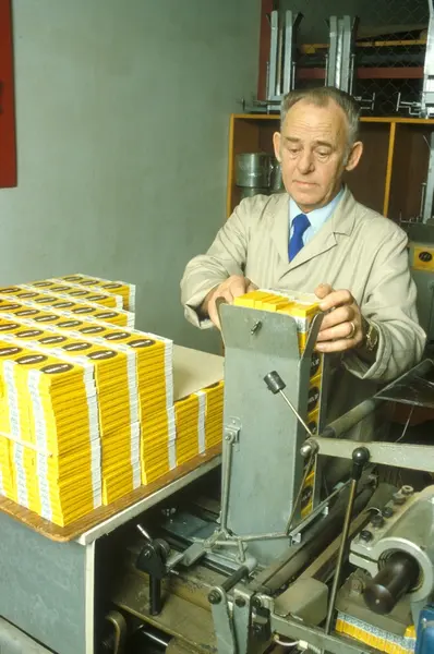Fabrikkinteriør. Kontroll og pakking. Produksjon av sigarer hos Tiedemanns Tobaksfabrik.