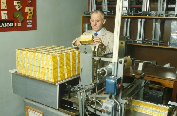 Fabrikkinteriør. Kontroll og pakking. Produksjon av sigarer hos Tiedemanns Tobaksfabrik.