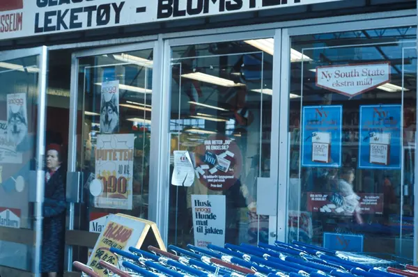 Inngangspartiet til CC på Majorstua, Oslo. Reklameplakater for South State sigaretter.