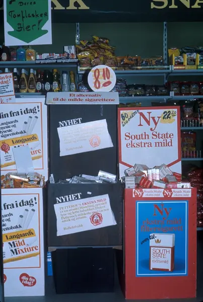 Butikkinteriør hos Trosterud super, Oslo. Vareplassering av tobakk i butikk.