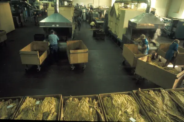 Fabrikkinteriør. Produksjon av tobakk hos Tiedemanns Tobaksfabrik. Fra billedserie til bruk ved presentasjon av Stjernesnitt sigaretter.