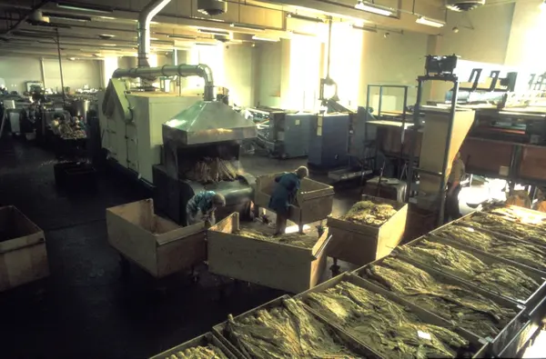 Fabrikkinteriør. Produksjon av tobakk hos Tiedemanns Tobaksfabrik. Fra billedserie til bruk ved presentasjon av Stjernesnitt sigaretter.