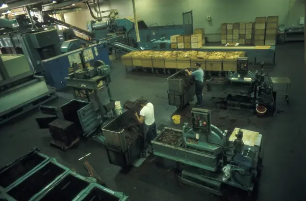 Fabrikkinteriør. Produksjon av tobakk hos Tiedemanns Tobaksfabrik. Fra billedserie til bruk ved presentasjon av Stjernesnitt sigaretter.