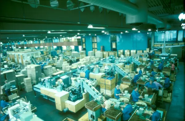Fabrikkinteriør. Røyketobakk tilberedning. Produksjon av tobakk hos Tiedemanns Tobaksfabrik. Fra billedserie til bruk ved presentasjon av Stjernesnitt sigaretter.