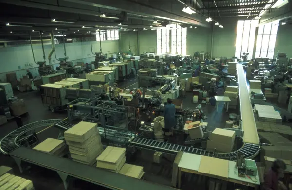 Fabrikkinteriør. Sigarettpakkeavdeling. Produksjon av tobakk hos Tiedemanns Tobaksfabrik. Fra billedserie til bruk ved presentasjon av Stjernesnitt sigaretter.