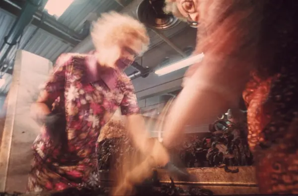 Fabrikkinteriør. H. Petterøe tobakksfabrikk, røyketobakk tilberedning. Bildeserie i forbindelse med presentasjon av Petterøes tobakk i 1970.